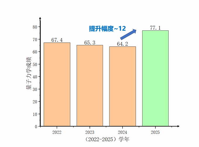 在 2025 年春季学期末的《电子材料理论物理II》课程考核中,采用交互式讨论教学法的 90 位学生取得了均分 77.1 分的成绩。经统计分析,这一成绩相较于 2022 至 2024 届三年间该课程的平均成绩(约 65分),实现了 12 分左右的显著提升,提升幅度达 19 %,如此大幅度的跨越直观且有力地印证了交互式讨论教学法在优化学习成果方面的实质性作用。这 12 分的差距并非偶然的数值波动,而是教学模式革新带来的系统性提升:从考核题型的得分分布来看,以往学生普遍失分严重的综合应用题(如定态跃迁理论方面的计算、实验现象理论分析等)得分率提升最为明显,从往届平均 35% 提高至 58%,充分反映出该教学法对学生知识掌握深度、逻辑推理能力及知识应用能力的切实强化。这一成绩提升打破了长期以来《量子力学》课程因理论抽象性强、数学工具要求高、物理思想深邃等特点导致的学生成绩普遍偏低且提升乏力的困境。