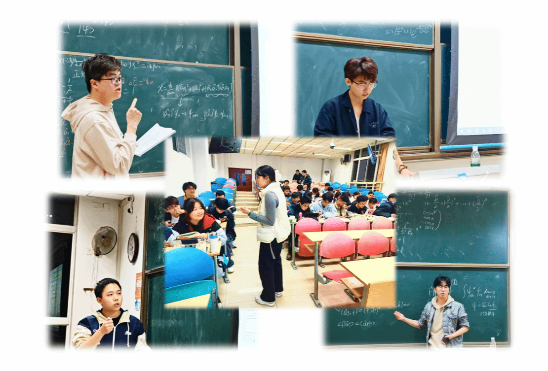 最后,研学学长与学生在讨论课中的互动构成知识深化的拓展层。研学学长按照提前构思的方案组织讨论课,讨论课每两周定期开展,内容与课程进度同步推进。课前,研学学长广泛收集同学们在 “硬核” 课程学习中的疑难困惑,将其精心改编成不同类型的题目;课上,同学们通过抽签领取题目——基础题型由单人独立攻克,复杂难题采用 2-3 人协作模式。在 30 分钟的思考时间里,为提升活跃度,课堂不设过多限制,允许自由讨论、随意走动或随时与研学学长探讨问题,不拘一格的形式可以为讨论营造轻松活跃的氛围。待思考环节结束,每一位讲题同学需到讲台上讲题,先剖析题目内涵,再逐步阐释解题思路与答案;讲解完毕后,研学学长进行细致补充并针对表现精准点评,明确亮点与可改进之处。这种以平等姿态开展的互动,一方面通过针对性提问、小组研讨等形式帮助学生巩固常规课程核心知识点,解决遗留理解困惑;另一方面,研学学长凭借符合学生认知规律的引导与建议,将相关领域入门研究方法融入学习,引入学科前沿案例与科研场景,引导学生将书本知识与科研实践建立关联。通过研学学长的反思整理与建议,学生在讨论中不断诞生有价值的观点,在持续修正中实现自我提升,既巩固了知识基础,又拓展了学术视野,助力知识应用与科研思维能力的培养。