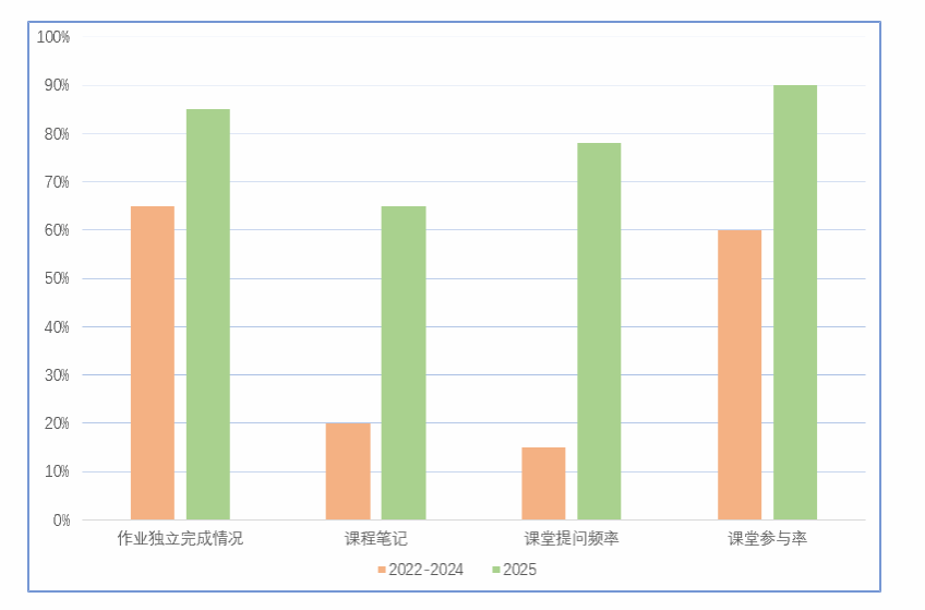 课堂提问次数较往届(传统教学)增加2.5倍,且提问类型从“公式记忆类”(如“波函数归一化条件是什么”)转向“逻辑质疑类”,课后在线答疑平台提问量减少20%,显示课堂讨论已解决多数即时性问题。