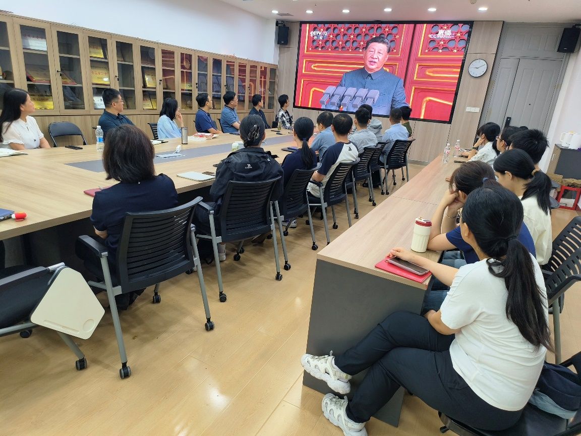 学院领导班子成员、两委委员、支部书记、各支部师生党员代表在南校区G142会议室集体观看,大家全体起立奏唱国歌,认真聆听习近平总书记重要讲话精神。阅兵式上,受阅将士迈着铿锵有力的步伐走过天安门广场,武器设备依次亮相,尽显我国国防力量强大。观看现场,师生们全神贯注,沉浸在阅兵仪式带来的震撼之中。当看到受阅方阵的精彩表现时,大家不禁爆发出掌声,表达内心激动与自豪。