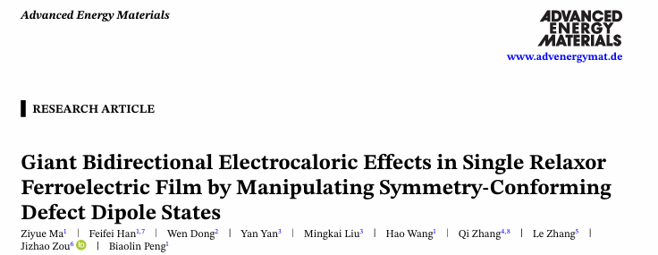 相关研究成果以“Giant Bidirectional Electrocaloric Effects in Single Relaxor Ferroelectric Film by Manipulating Symmetry-Conforming Defect Dipole States”为题,发表于材料领域顶级期刊《Advanced Energy Materials》 (2025年影响因子26.8)。h漫