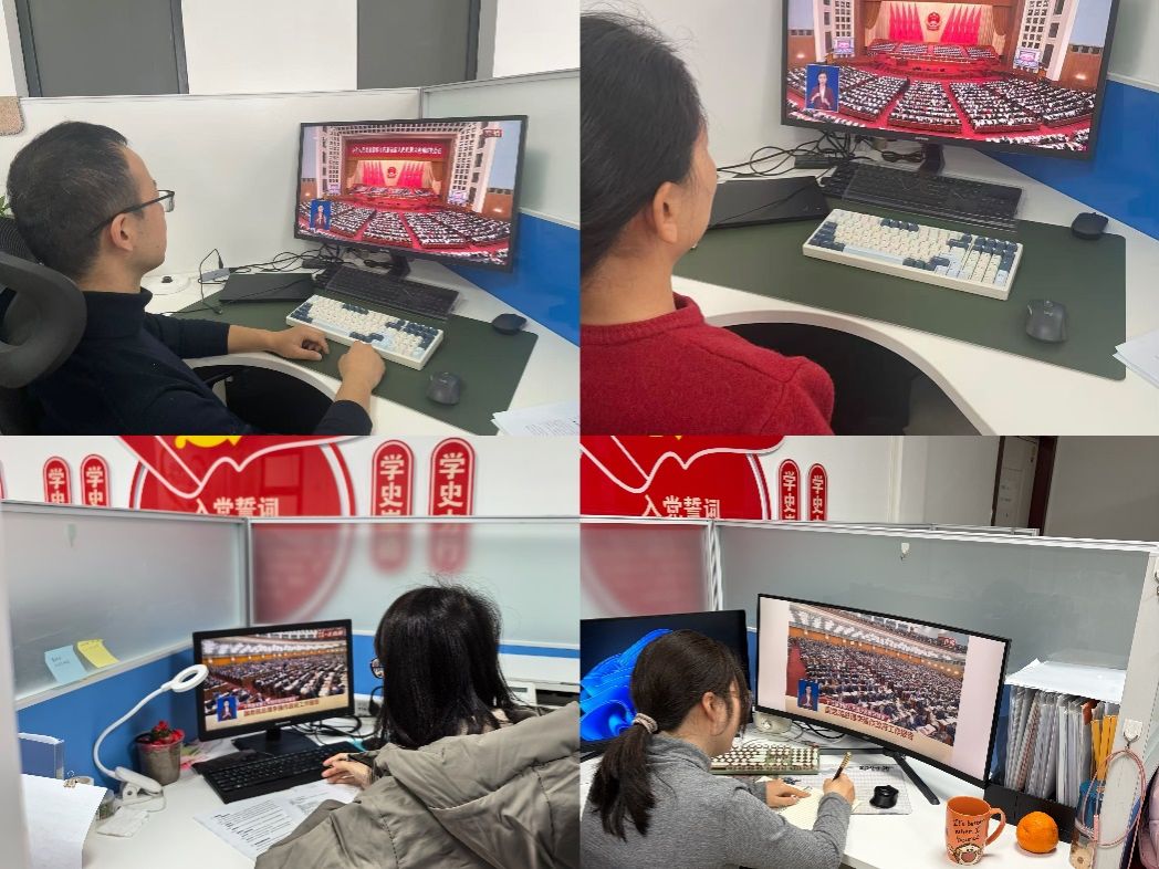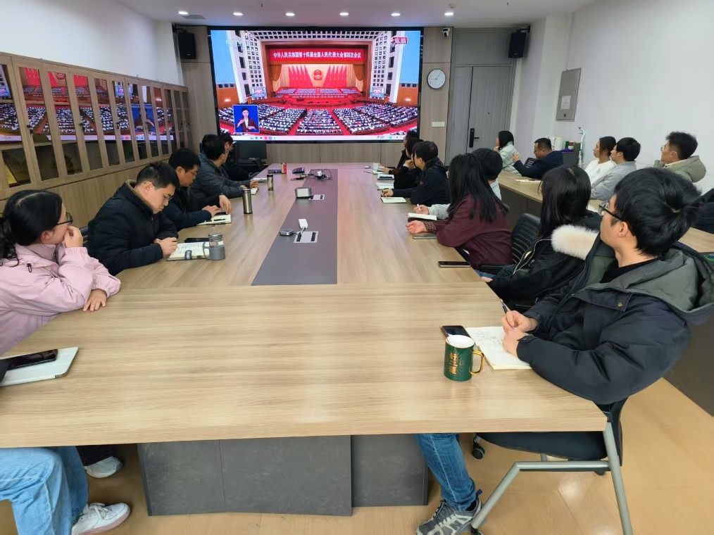 学院领导班子成员、机关管理干部、师生党员代表在南校区G142会议室集体观看学习,大家全体起立奏唱国歌,认真聆听李强总理政府工作报告。直播结束后,各系所、各支部教师学生结合本职工作和学习,开展热烈讨论和交流。