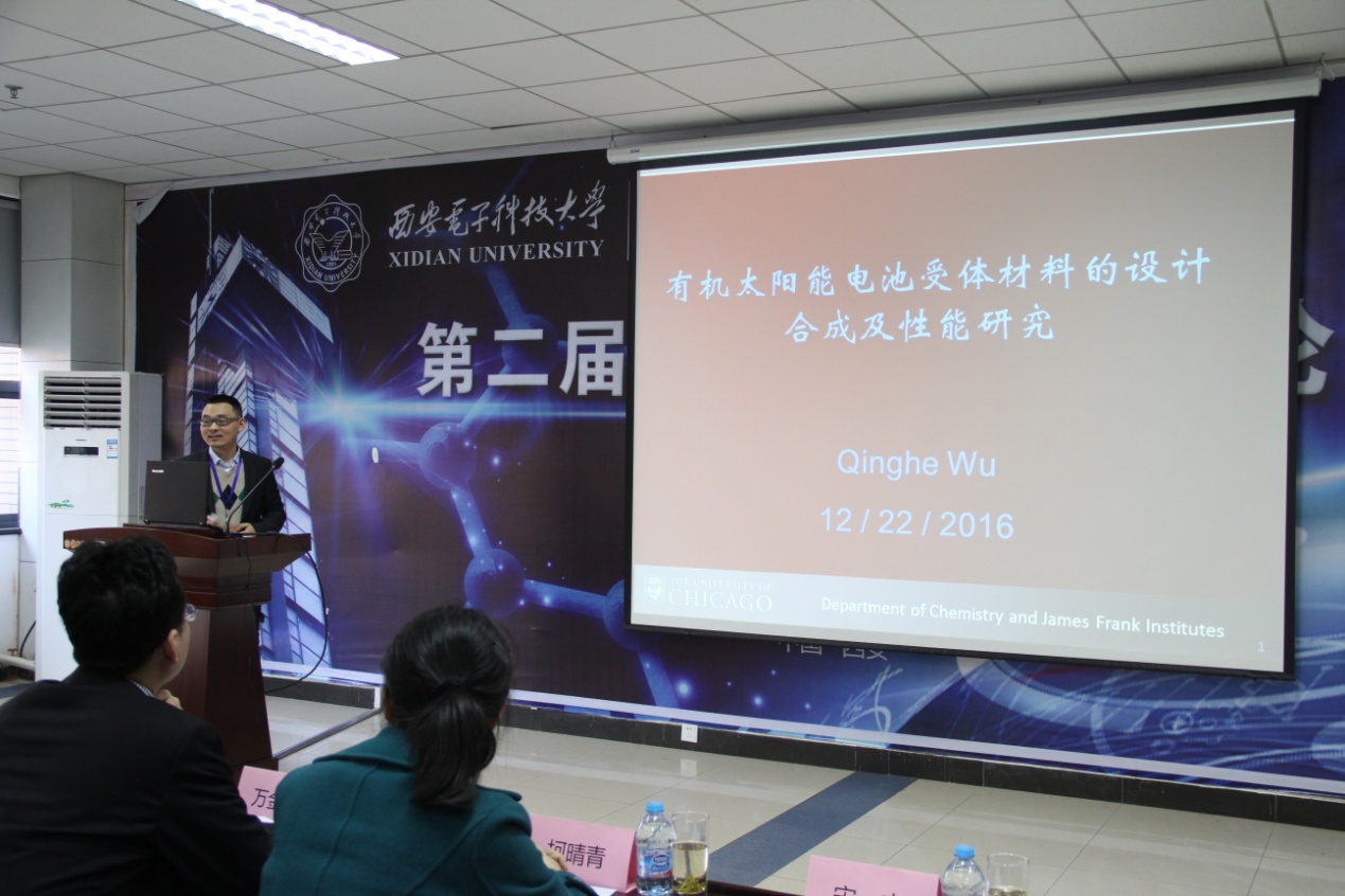 来自美国芝加哥大学的武庆贺博士以《有机太阳能电池受体材料的设计合成以及性能研究》为题拉开了本次会议的序幕。他介绍了有机太阳能电池(OPV)相比于硅基太阳能电池有绿色环保等诸多优势,然而,该类电池的电子受体材料PCBM的高昂成本促使人们寻求成本低且高效的电子受体材料来代替PCBM。他尝试设计了诸多平面性好的电子受体材料,其中α位取代的苝二酰亚胺受体材料因为电子离域效应,可提高电子的迁移率,增加电子空穴之间的距离,有利于克服电子空穴之间的库仑力,从而使太阳能电子器件性能数据提升至8.5%。他研究了影响有机太阳能电池受体材料效率的因素,包括:(1)分子共轭骨架的扭曲;(2)引入多个受体单元促使电荷离域;(3)分子共轭骨架的刚性。