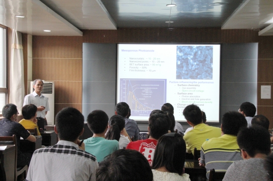 曹国忠教授介绍了其课题组在纳米材料应用于能源转换和存储领域的研究工作,重点从纳米结构光阳极在染料敏化与量子点敏化太阳能电池中的应用、纳米结构 电极在锂离子电池中的应用,以及多孔碳及其表面修饰在超级电容器中的应用等三个方面进行了介绍。h漫