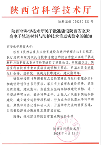 牵头申报的“陕西省空天高电子轨道材料与防护技术重点实验室”获批立项建设,标志着我院高水平平台建设取得新进展。