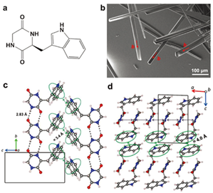 甘氨酸-色氨酸形成机械坚固(弹性模量高达24.0GPa)和热稳定性高达370°C的单斜晶体,该晶体具有独特的光学性质,包括聚集诱导的蓝光发射和异常稳定的光致发光。此外,由于晶体的压电系数高达14.1pC N−1,器件的开路电压达到1.2V。这些发现证明了利用自组装肽制造集高结构稳定性、特定的光电子学和显著的能量获取性能于一体的生物集成微器件的可行性。
