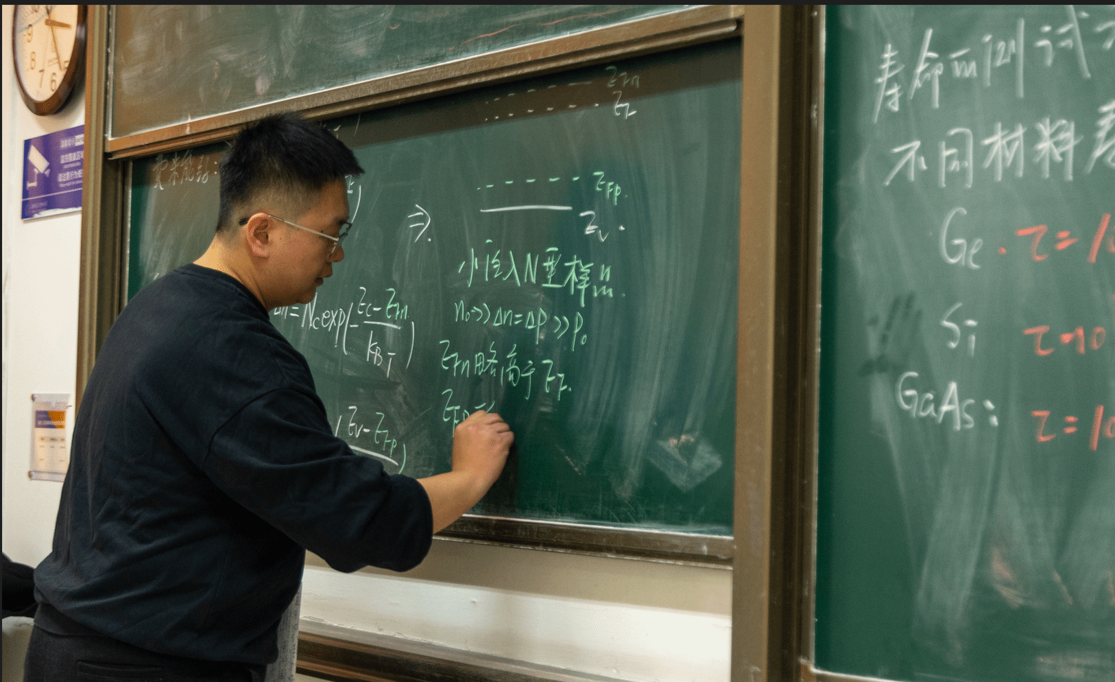 “作为一名教师,站稳讲台是首要任务。”为此,周龙一直向学院的教学名师和前辈虚心求教,汲取教学经验和智慧。在担任助教期间,周龙参与了黄云霞老师省级精品课程《固体物理》的建设和学习,深刻体会到了教师站稳讲台的艰辛与不易。黄云霞老师认真负责的教学态度,以及“讲好课,育好人”的教学理念,深深地影响了他,成为他教学生涯中的宝贵财富。“目前,我主讲《固体物理》《半导体物理》《固体电子器件》课程,课程量不算多,因此每一次备课,我都会精心规划板书的内容,力求做到既简洁明了又生动有趣。” 在讲台上,周龙总是充满激情和活力,善用生动的例子和有趣的故事,来激发学生的学习兴趣和求知欲,让学生在学习过程中能够有所收获。课后,学生们也愿意主动找周老师请教问题,共同探讨学术难题。这种良好的师生关系不仅促进了学生的学习进步,也为学生今后的科研道路奠定了坚实的基础。