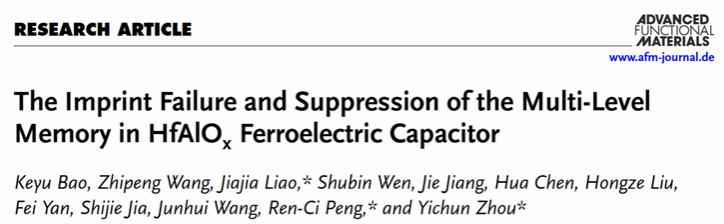 周益春教授团队在这一研究领域取得重要进展。研究团队在多值HfAlOx铁电电容中发现尽管饱和极化状态受到印记影响后仍能被准确写入,但所有中间极化状态的写入却完全发生错误。针对这一发现,团队重点分析了印记效应产生前后铁电电容内建电场和带电缺陷(主要是带电氧空位)的变化及其关联,提出了多值存储极化状态影响带电氧空位分布并形成非均匀内建电场、进而导致中间极化状态无法被准确写入的失效模型。该模型通过相场模拟得到了进一步验证。在此基础上,团队设计了一种预编程方法,通过使铁电薄膜的内氧空位重新分布来抵消印记效应的影响。实验证明该策略能在室温环境下实现长期稳定的准确编程,为发展可靠的多值HfO2基铁电存储器提供了新的途径。该研究成果以“The Imprint Failure and Suppression of the Multi-Level Memory in HfAlOxFerroelectric Capacitor”为题发表在材料领域著名学术期刊Advanced Functional Materials上(2024年影响因子为18.5)。论文的第一单位为h漫