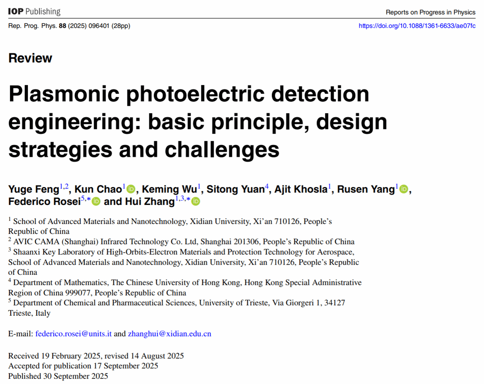 张辉老师和意大利的里雅斯特大学Federico Rosei教授(欧洲科学院院士,加拿大皇家科学院院士,加拿大工程院院士,发展中国家科学院院士)合作受邀以“Plasmonic photoelectric detection engineering: basic principle, design strategies and challenges”为题,在影响因子为20.7的物理类国际顶级期刊Reports on Progress in Physics上发表了综述论文。