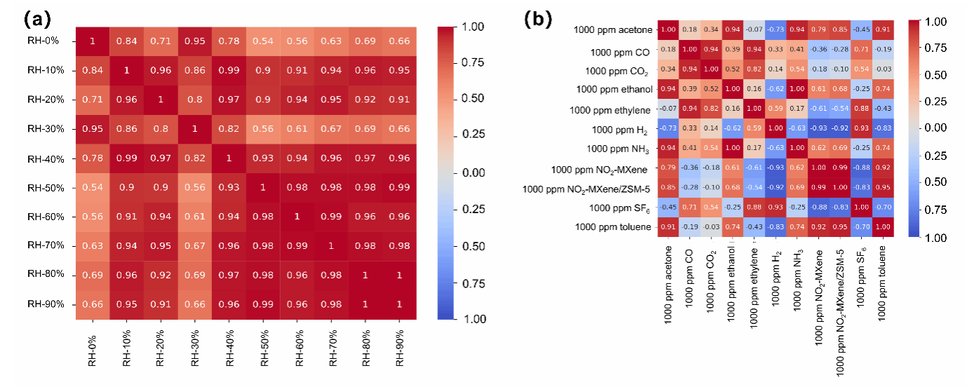 图2. (a) 传感器在不同湿度下对500 ppm NO2响应的相关性分析;(b) 对1000 ppm不同气体与纯MXene对1000 ppm NO2响应的相关性分析。
