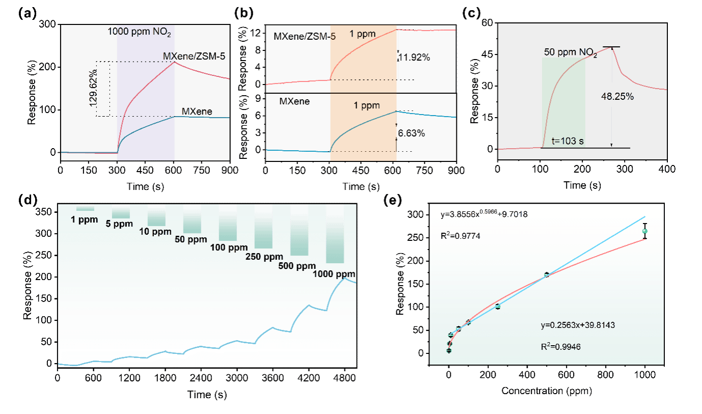 图1. (a) MXene/ZSM-5与纯MXene对1000 ppm NO2的响应对比;(b) 对1 ppm NO2的响应对比;(c) 对50 ppm NO2的实时响应-恢复曲线;(d) 不同浓度NO2下的响应值及拟合曲线。