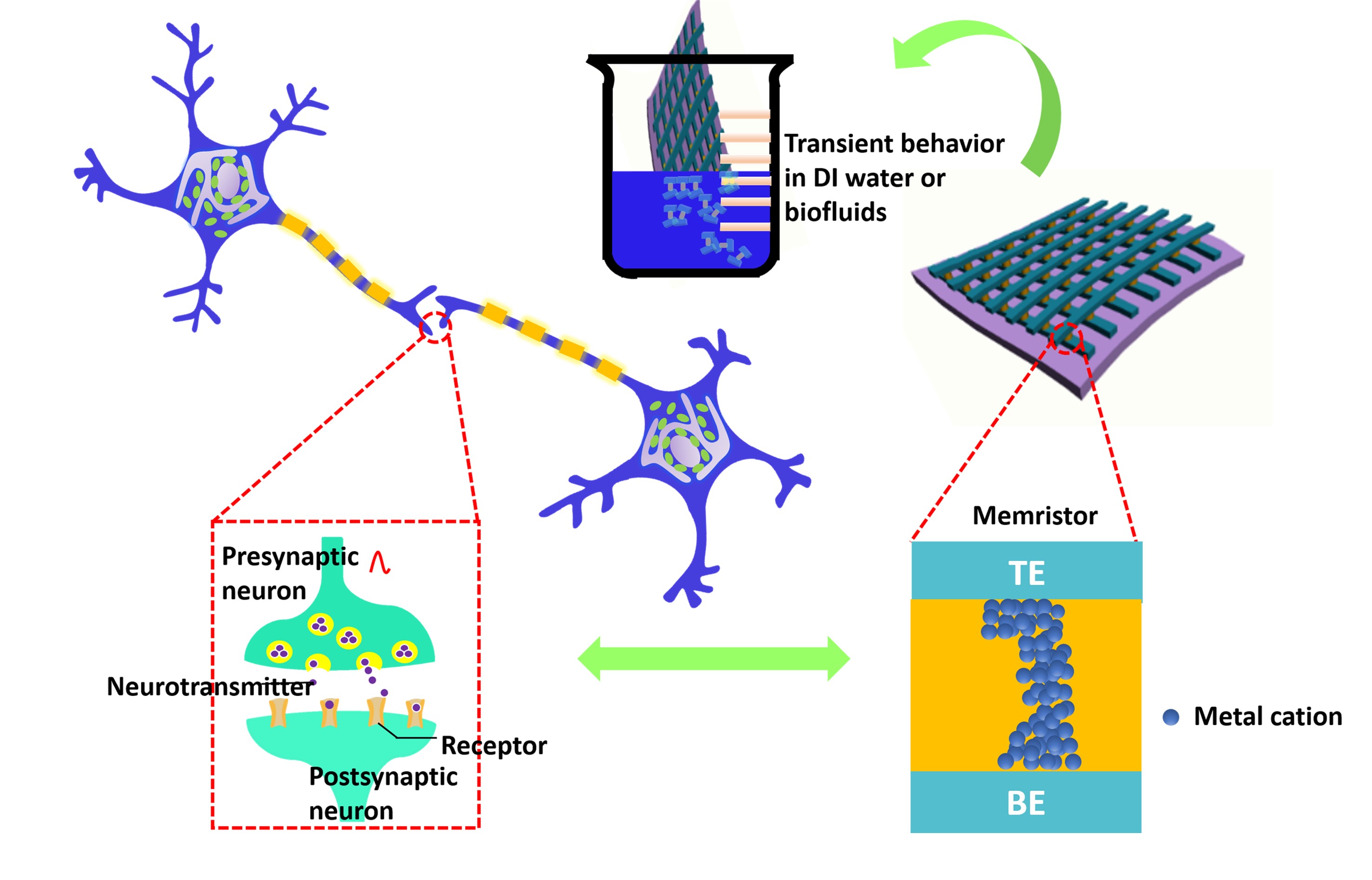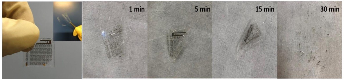 模仿人脑神经网络的类脑神经形态器件可构建高智能、低功耗类脑芯片。有记忆功能的非线性电阻-忆阻器,能够用来模拟生物突触和神经元的信息处理功能,是实现人工神经网络的理想选择。另一方面,物理瞬态电子是指电子器件或者系统在完成它的使命后可物理消失。将可随需消失的瞬态材料与忆阻器件结合起来,可实现神经网络的安全应用。例如,当信息安全受到威胁时,可以将瞬态芯片设备扔进水里,同时这样的设计还可以产生更环保的电子器件。近日,团队在该领域取得重要进展,成功设计了一种可溶于水的神经形态忆阻器件。