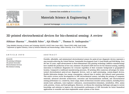 Ajit Khosla教授在国际顶级期刊《Materials Science & Engineering R-reports》发表了题目为:3D printedelectrochemical devices for bio-chemical sensing: A review的论文,综述了3D打印电化学传感器的最新发展,并希望将其应用于未来生物医学领域的可穿戴和智能植入式传感器系统。