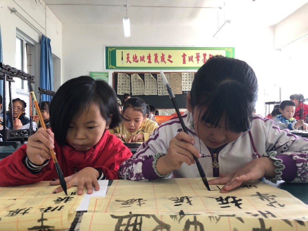 我院研究生郭建新对五年级的同学们进行了书法教学。他耐心地讲解了横竖撇捺点和横折六种基本笔画的书写方法,之后通过“振兴中华”四个字的书写演示向同学们介绍了如何把握字的形态。郭建新同学扎实的书法功底和高超的书法水平赢得了同学们的阵阵喝彩和惊呼。通过手把手地指导同学们,部分同学的书写水平明显进步。经过评比,遴选出最佳作品,并将郭建新同学事先准备的个人书法作品赠予作者作为奖励。最后向每一位参加书法课的同学赠送了一套书法用品,鼓励同学们坚持练习毛笔字,学习中华传统文化。