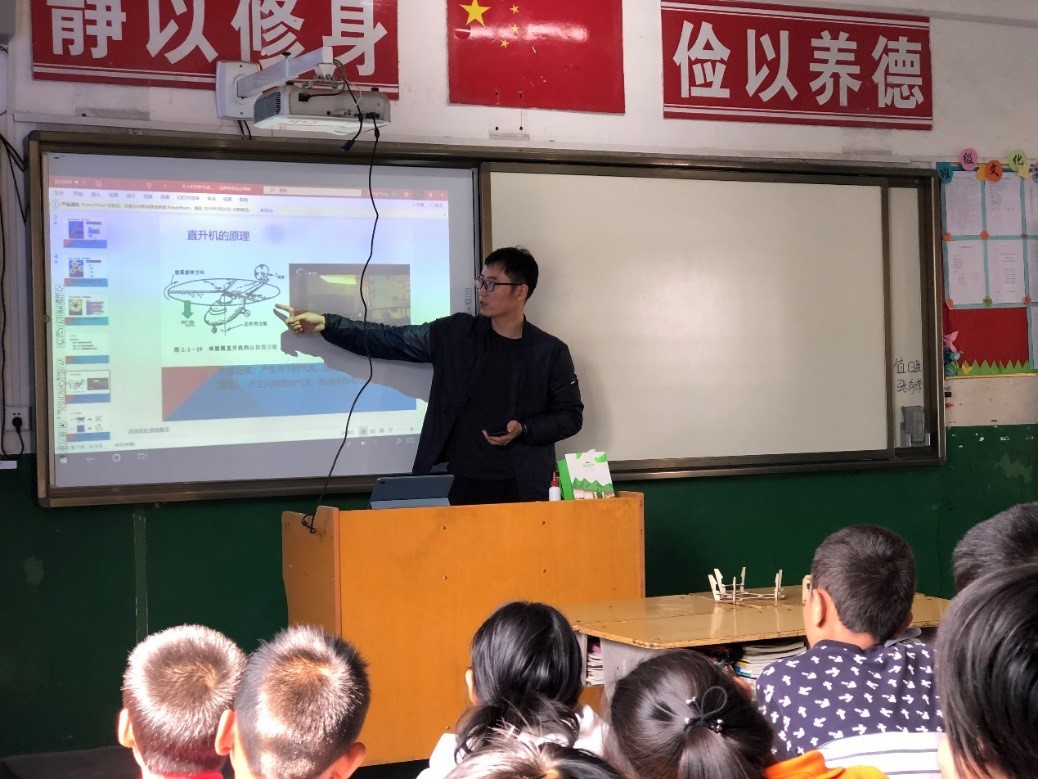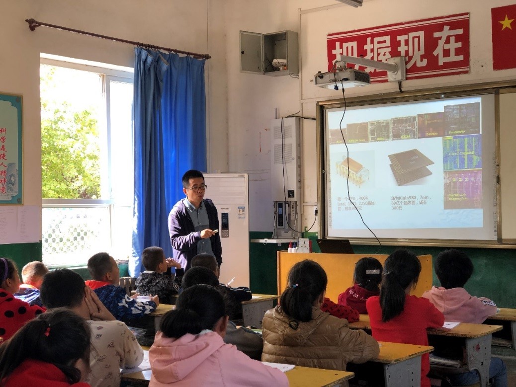 按照事先计划,扶贫小组接下来开展了三项教学活动,包括科普讲座《芯片的故事》,科普演示《无人机与积木式编程》和人文教学《学写毛笔字庆国庆》。