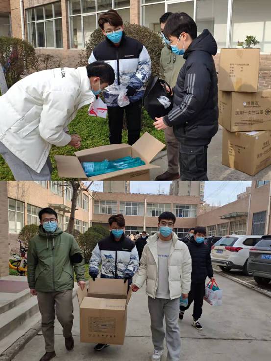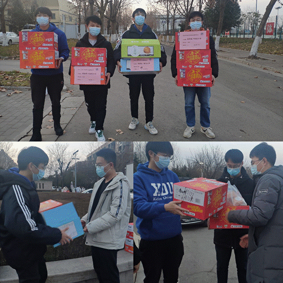 学生志愿者们“全人力”搬运、发放口罩、干粮、水果等物资,