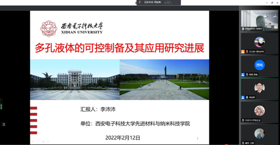 李沛沛博士的报告题目为《多孔液体的可控制备及其应用研究进展》。他讲到,多孔液体是一种具有稳定孔隙结构且呈现宏观液体流动状态的新型多孔材料,综合了多孔固体材料的有序孔道结构和液体的连续性、稳定的传质性等优点,在气体捕集与分离、催化、光热转换等方面拥有巨大的应用潜力。李博士详细介绍了多孔液体的分子结构特点与制备方法,并阐述其在气体吸附与分离,混合基质膜,催化,气体传感器,主客体化学等方面的应用研究进展。