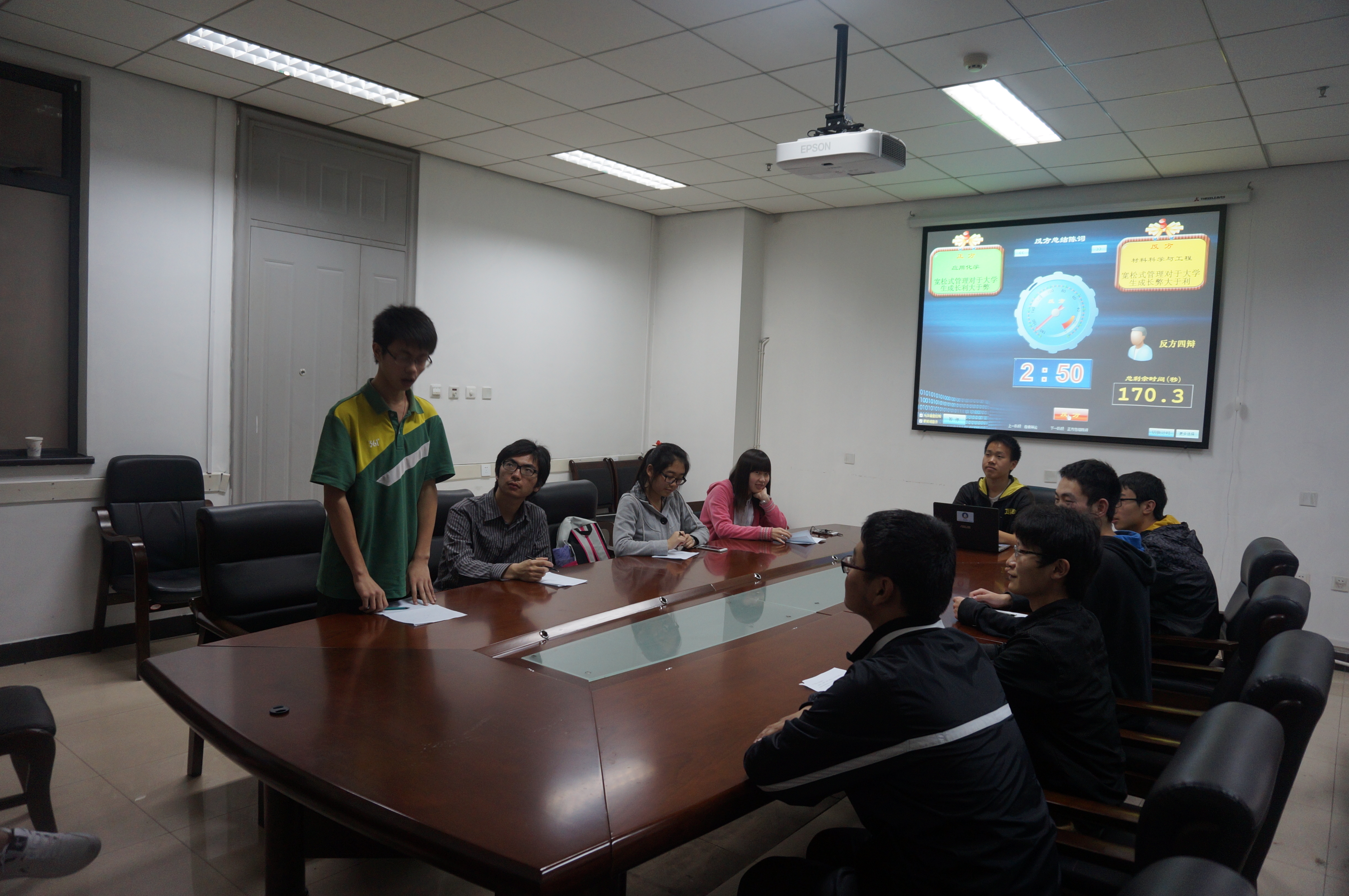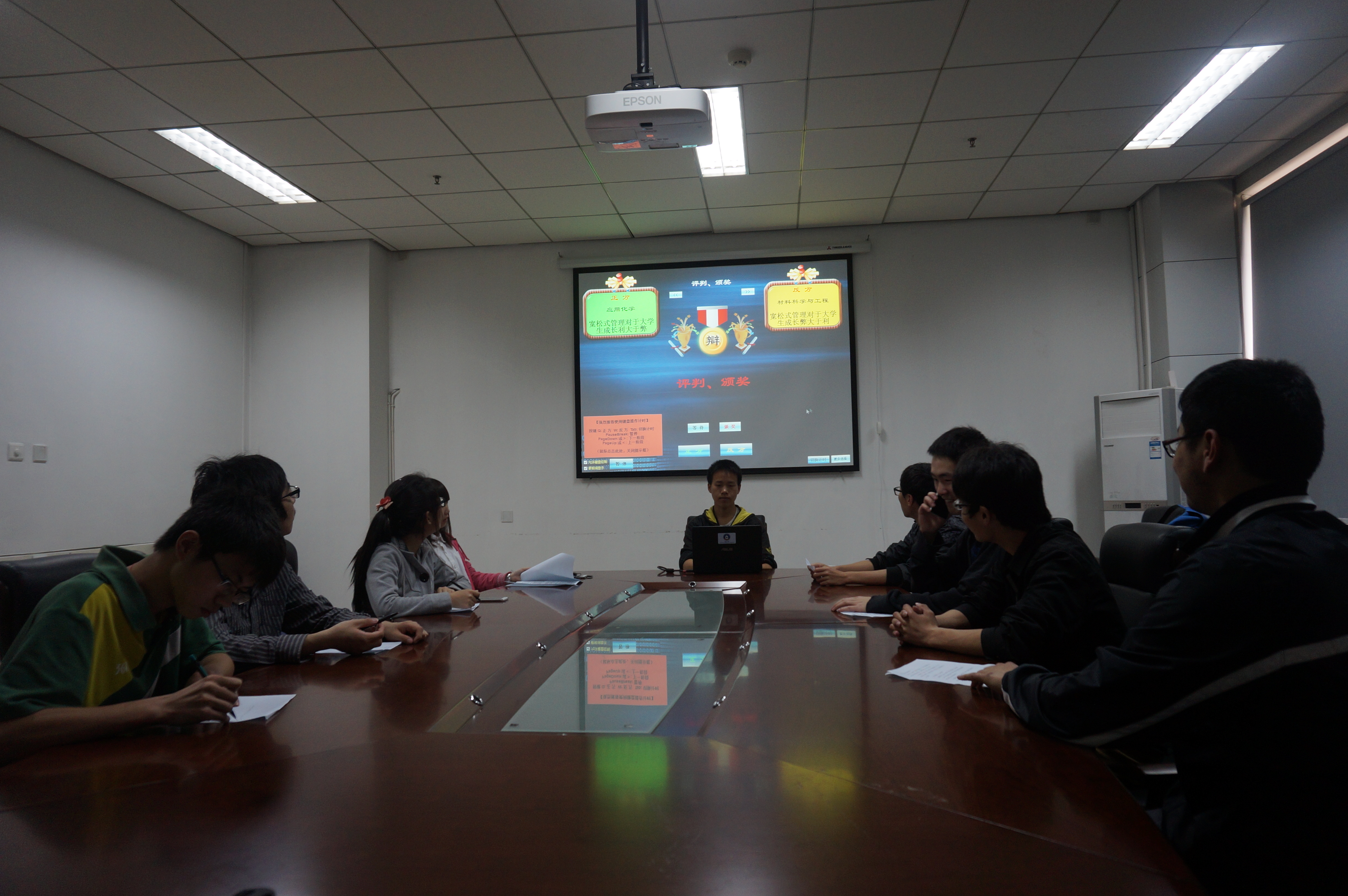 在G楼119举行“学在西电”辩论赛活动。 本次辩论赛由我院辩论队队长李天担任主席。正方为应用化学专业代表队,反方为材料科学与工程代表队,双方就“宽松式管理对于大学生成长的利与弊”这一论题展开了激烈而又精彩的辩论。