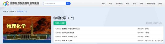 共有70门课程首批入选。其中,我院梁燕萍教授负责主讲的《物理化学》(上、下)课程上线国家智慧高教平台,也成为我院首批在智慧高教平台上线的慕课课程。