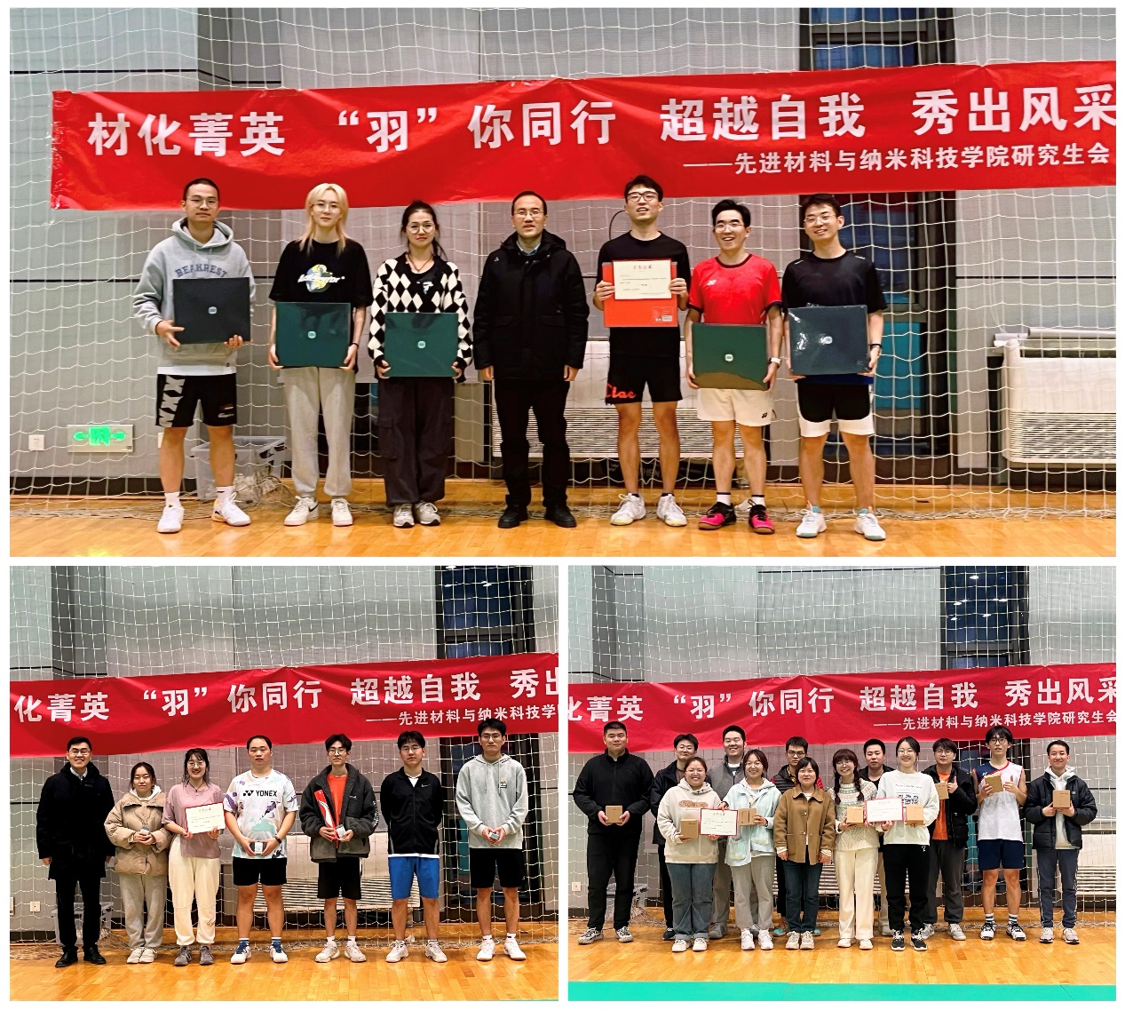 研究生会举办了“燃火冬日,羽邻相约”羽毛球交流赛,比赛于12月4日晚上在远望谷体育馆拉开序幕。本次比赛以课题组为单位自由组队,分单打、双打以及混双三种赛制,8支队伍共计50余人报名参赛,学院党委书记宋刚锋、党委副书记陈刚、研究生辅导员刘男参加颁奖。