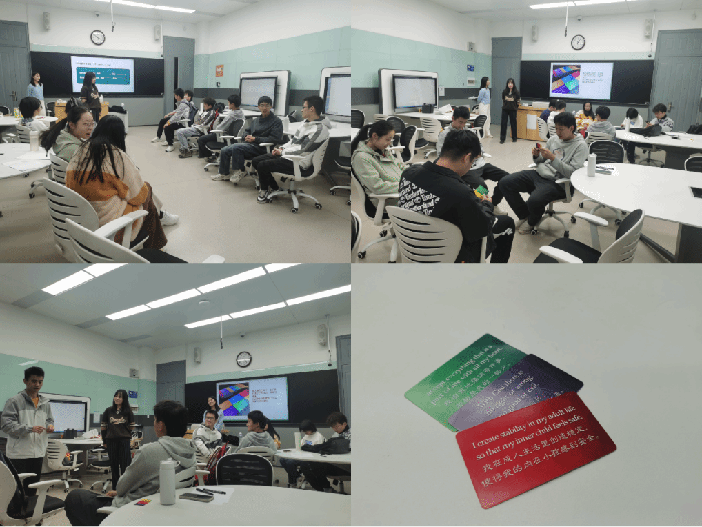 自我探索之旅是本次活动的一个亮点。同学们通过一系列自我探索活动,深入了解自己的内心世界,发现未知的自我。在“彩虹卡探索”环节中,同学们以小组讨论的方式,通过随机抽取的三张彩虹卡,探索自己的过去、现在和未来。这一过程不仅让大家对自己的认识更加深刻,还激发了他们对未来的思考和规划。同学们通过相互引导,共同穿越障碍,体验了信任与被信任的重要性。同时,在这个环节中,大家逐一分享自己的经历和感受,让同学们对自身的发展有了更加深入的思考。