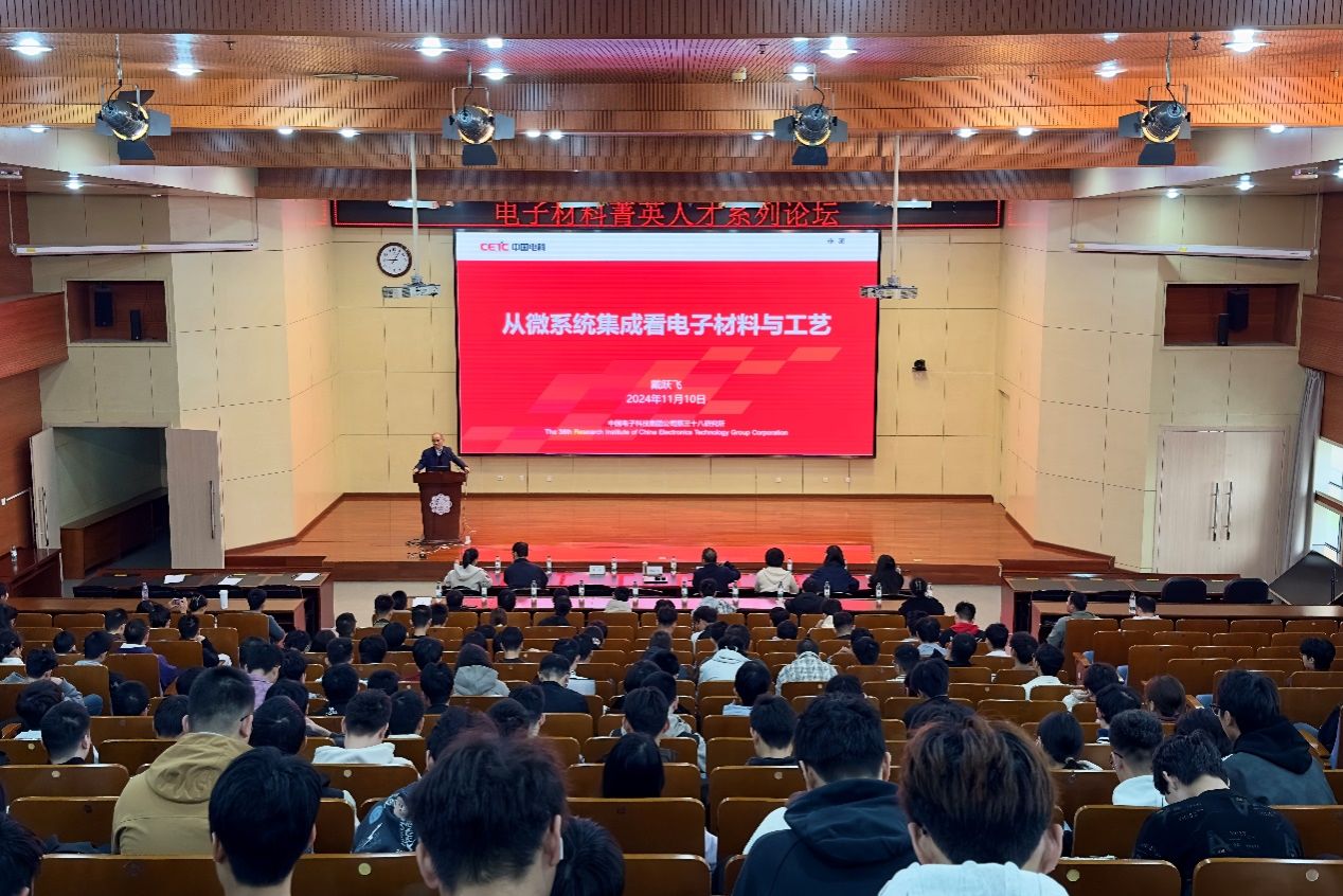 在南校区行政楼210报告厅举办了“电子材料菁英人才系列论坛”。受周益春教授邀请,中国电科首席专家、中国电科第38研究所副总工程师戴跃飞研究员以“从微系统集成看电子材料与工艺”为主题,带来了一场内容丰富、科学与工程结合紧密的学术报告。报告会由周益春教授主持,学院教师代表、研究生和来自不同专业的两百多名本科生参加了报告会。